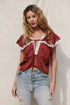 Fantastic top from American Jen's Pirate Booty, the product belongs to the autumn collection and will be in stock 1/7. All orders placed before then are pre-orders. The top comes in the color carnelian, made of 100% viscose with beautiful details of lace, decorative mother-of-pearl buttons and ties.