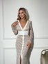 This glamorous lace maxi dress in ivory white is perfect for weddings, proms and date nights. The dress is beautifully V-necked and decorated at the waist with a silky satin fabric. Deep V-neckline and open back bring this dress to life from every angle. The dress is super feminine and has a long hemline, can be worn to weddings, proms, graduations, birthday parties, cocktails with friends or a date night. See size chart below, as sizes may be slightly smaller than normal.