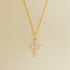 Ett stilrent och elegant korshänge, dekorerat med vita pärlor i pärlemor som symboliserar renhet och sofistikation. Perfekt som en personlig gåva eller en tidlös accessoar för att komplettera din look.