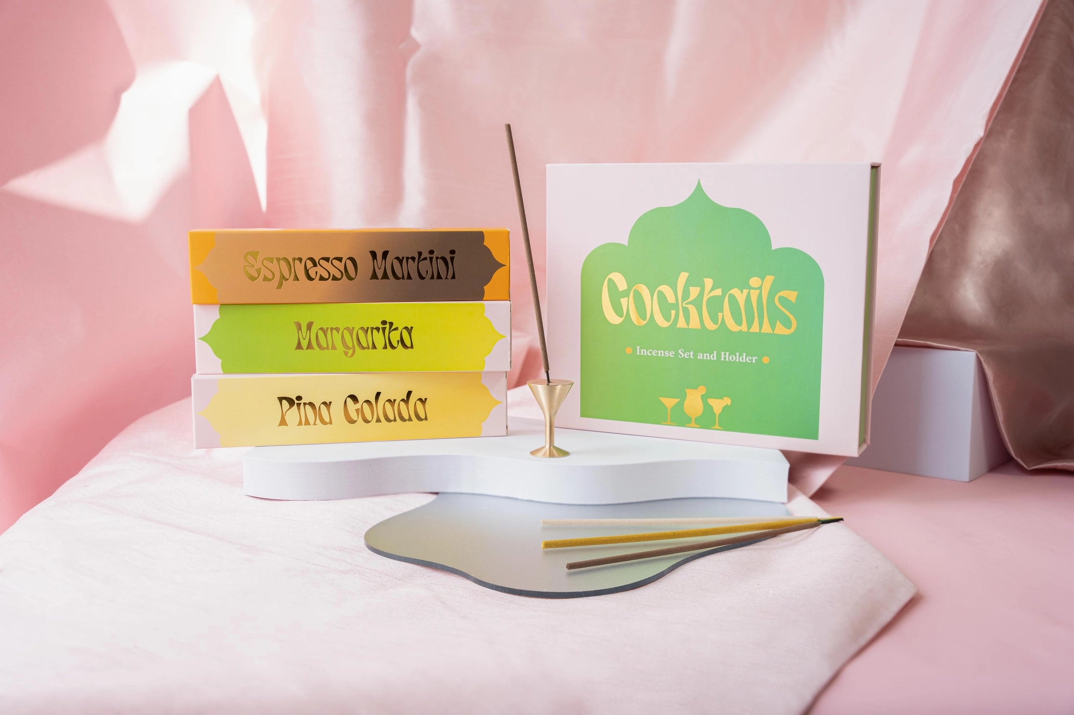 Denna presentförpackning med rökelser är inspirerad av några av våra favoritcocktails.  Presentförpackningen kommer med tre dofter och varje doft levereas i fin förpackning med 20 rökelsepinnar: Pina Colada (Ananas & Kokos), Espresso Martini (Kaffe & Vanilj) och Margarita (Citron & Lime). Självklart matchas kitet med den en rökelsehållaren i mässing iform av ett martiniglas. Otroligt fin och rolig gå-bort-present som levereras i en lyxig guldfolierad box.