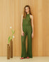 Det öppna zigzag-virkmönstret skapar en skulptural men samtidigt luftig silhuett, medan den ribbade midjan med resår ger en följsam passform som smickrar varje rörelse. Den vida designen adderar en känsla av lätthet och sofistikerad bohemlyx – perfekta för såväl stadspromenader som sensommarkvällar.