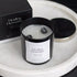 Det stilfulla svarta glaset döljer ett mjukt grått vax där två polerade hematitstenar ligger synliga – ett vackert inslag som gör ljuset lika dekorativt som meningsfullt.